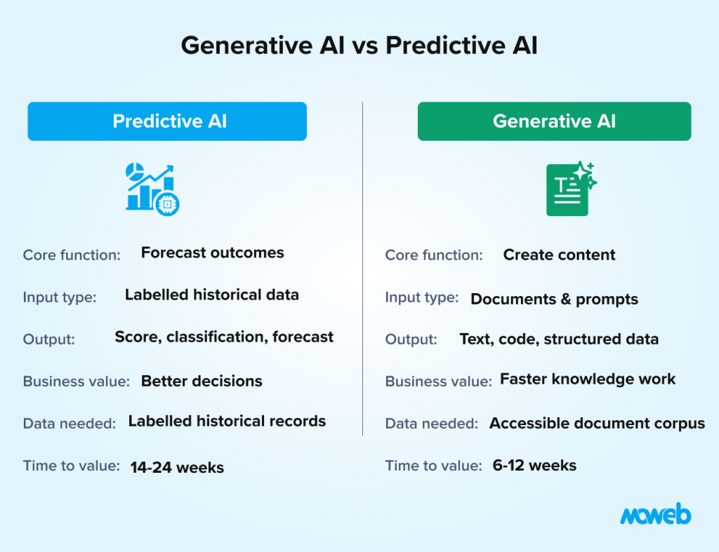 Implication for first investment: If your data is primarily in documents, emails, wikis, and PDFs rather than structured, labelled datasets, generative AI is probably the more data-ready starting point. If you have years of clean, labelled operational data for a specific decision domain, predictive AI can leverage that immediately.